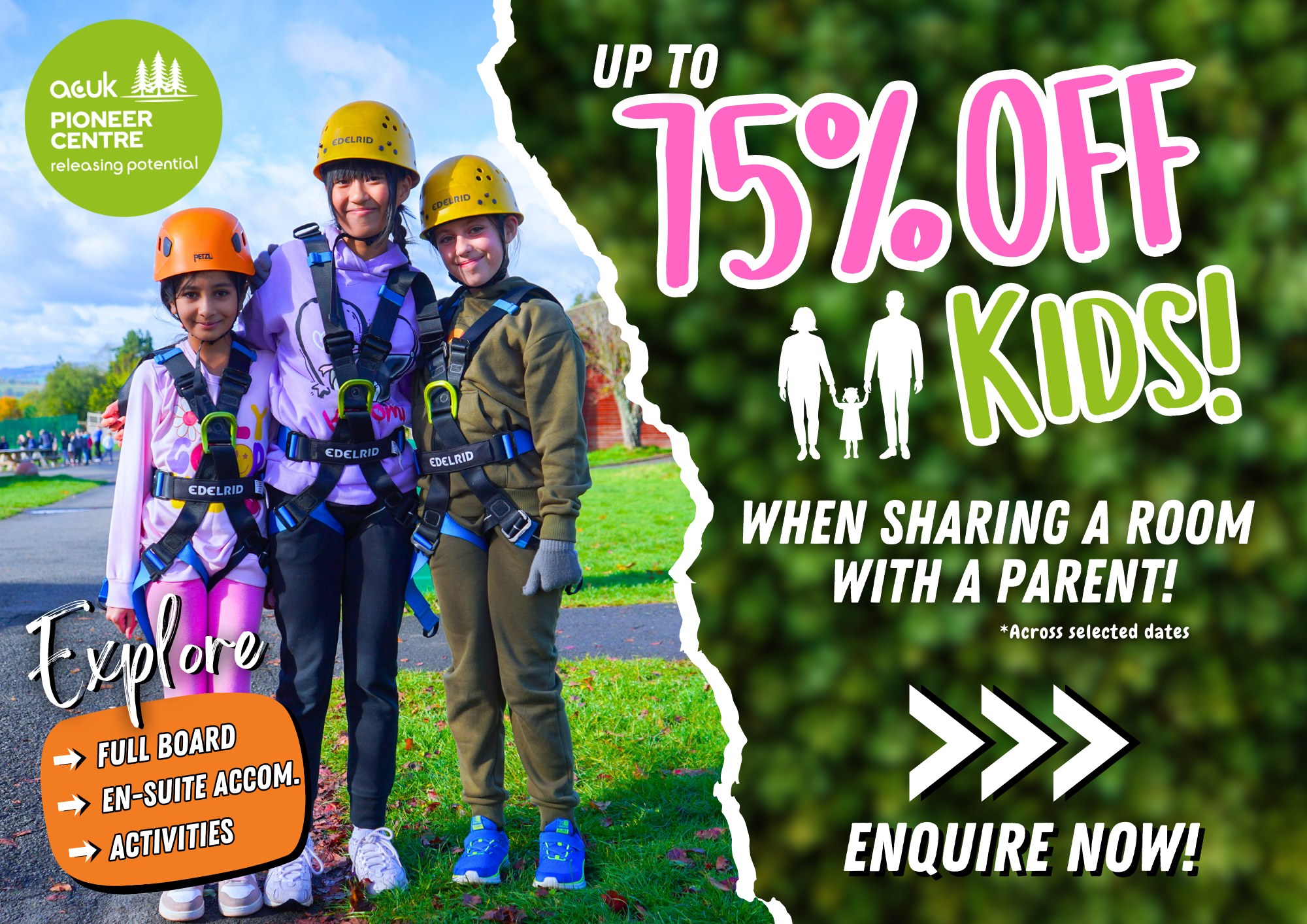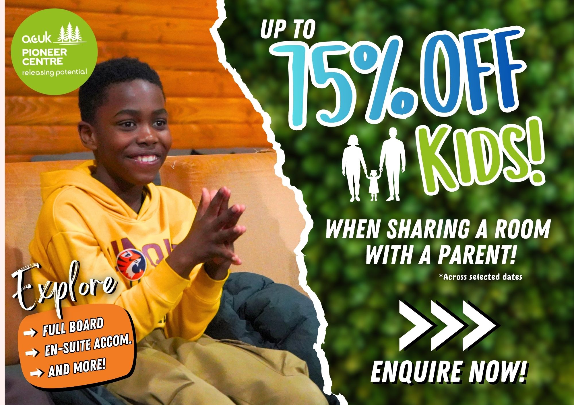 We don’t want there to be any reason for the parents to not attend a weekend away, so now, for kids sharing a room with their parents we will take up to 75% off their booking rate!